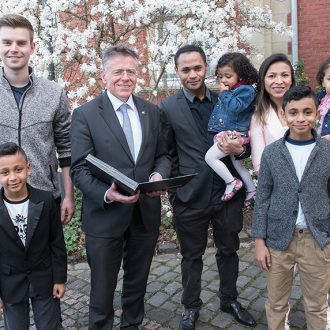 Zeremonie im Kreishaus des Rhein-Kreises Neuss in Grevenbroich: Landrat Hans-Jürgen Petrauschke machte Borussia Mönchengladbachs Stürmer Rafael Caetano de Auraújo und seine Familie endgültig zu deutschen Staatsbürgern. Er sagte bei der …