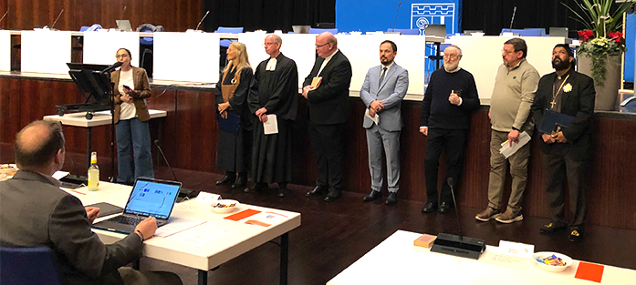 Die bei den Kommunalwahlen am 14. September 2025 gewählten Abgeordneten sind am gestrigen Nachmittag (05.11.25) in die Kaiser Friederich Halle auf dem Bökel zur konstituierenden Sitzung geeilt. Bevor sie sich einer umfangreichen Tagesordnung zuwandten wurden sie Zeuge einer interreligiösen Zeremonie zu der sich Brigitte Hoth (Buddhismus), Stephan Dedring (Evangelische Kirche), Ulrich Clancett (Katholische Kirche), Besnik Kadriolli (Islamische Gemeinde), Michael Kogan (Jüdische Gemeinde) und Michael Chandrathas (Blessing Church) versammelten. Bemerkenswert, trotz aller Unterschiede – mit Ausnahme der Buddhisten – glauben alle an den einen Gott, der das Universum erschuf, so auch die Erde. Alle setzten unterschiedliche Akzente, Viele der kuren Ansprachen – wobei natürlich auch die zweite Gründung Mönchengladbachs durch den Abt Sandrad und seine Mönche zur Rede kam – endeten mit einem „Amen“.