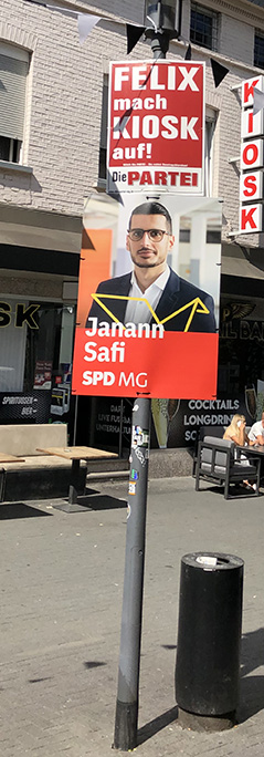 Für den Betrachter ist diese Wahlwerbung ein wenig mühsam, hängen die Plakate doch sehr hoch und wenn sie lediglich Köpfe zeigen von bisherigen Rastmitgliedern, auch weiblichen, nicht sehr hilfreich. Dann gibt es auch noch ein paar Sprüche, von denen eigentlich nur die etwas überraschenden im Gedächtnis blieben, so z.B. die der Satirepartei, die Heirnichs nach der Wahl empfiehlt, einen Kiosk aufzumachen oder die der Grünen, die Wirtschaft um die Ecke empfehlen, wobei nicht ganz klar ist, was damit gemeint ist, jedenfalls nicht, Wirtschaft um die Ecke bringen, was ihnen zwar nicht in Gladbach, aber vielleicht für Berlin nachgesagt wird.