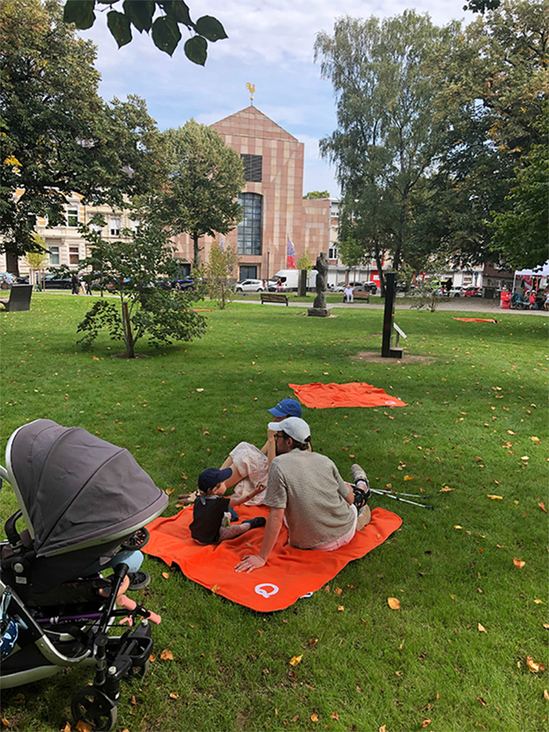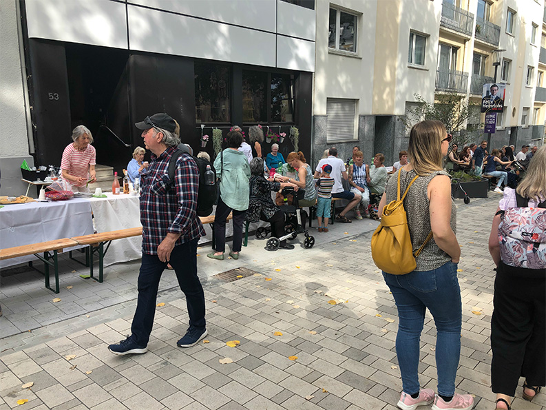 Durch die Neugestaltung der Kaiserstraße entlang dieser Parkseite ist die frühere Barriere aus Asphalt und Bordsteinkanten einer ebenerdige, durchgängig gepflasterten Fläche gewichen Vor der Bibliothek und dem Maker Space ist kein motorisierten Verkehr mehr möglich, dahinter ist ein Wendehammer mit ausgewiesenen Stellflächen an den Seiten. Auch die vier Hochbeete, die mit Felsenbirnen bepflanzt werden, bringen den Platzcharakter dieses Straßenabschnitts zur Geltung. Am heutigen Tag der Eröffnung wurde der Bereich von Anwohnern mit Tischen und Bänken belegt, auf denen Erfrischungen auf die warteten, die sich diesen wunderschönen Tag zunutze machten und ihn und die Sonnen genossen