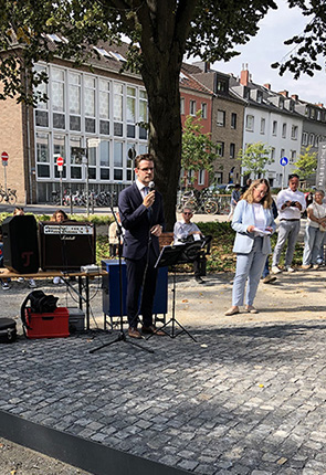 Der Tag der Wiedereröffnung des Parks, der Adenauerplatz heißt, wäre nicht komplett, wenn nicht Oberbürgermeister Felix Heinrichs, begleitete von der Dezernentin für Stadtplanung (u.a.), Claudia Schmitz-Schwan ein paar Worte an seine Zuhörer gerichtet hätte. Er gab seiner Freude Ausdruck, dass hier nun ein städtisches Kleinod entstanden ist, das sich in das grüne Band einfügt, dass die Stadtteile Rheydt und Gladbach verbindet. Klar, dass er sich bei den Handwerksbetrieben bedankte, die das geschaffen haben und von denen Mitarbeitende anwesend waren.