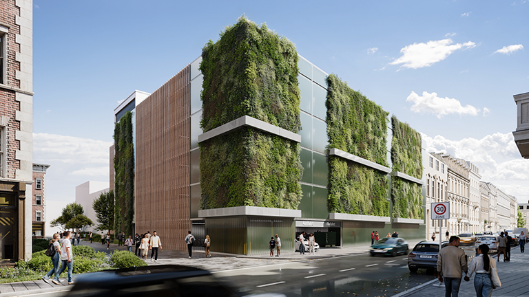 Das Parkhaus fügt sich mit seiner Architektur harmonisch in das Stadtbild ein. Entlang der Staufenstraße entsteht eine vom eigentlichen Parkhaus schräg abgerückte Schallschutzfassade aus Profilbauglas, die mit begrünten Pflanzkästen versehen ist. Hofseitig werden bodengebundene, begrünte Profilbauglasfassaden umgesetzt, während die übrigen offenen Fassaden eine Lamellenverkleidung in Holzoptik erhalten, die eine natürliche Belüftung des Parkhauses ermöglicht.