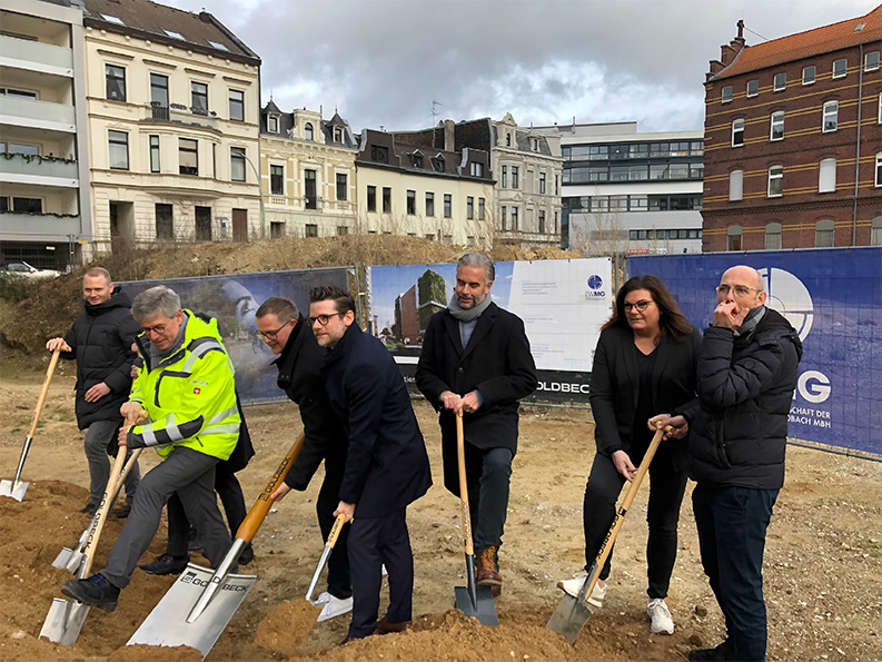 Es kommt Bewegung in das Bauprojekt auf den Maria Hilf Terrassen. Erste Grundstücke sind in der Vermarktung, insgesamt 350 Wohneinheiten sollen hier entstehen, ein luftiges, grünes Quartier in unverbaubarer Südlage, ein Impuls für die Stadtentwicklung. Noch ehe hier das erste Grundstück zum Wohnen aufbereitet wird, beginnt der Bau einer Quartiersgarage für das neue, weitestgehend verkehrsberuhigte Wohnquartier. An einem sonnigen, aber kaltem Freitag fand der erste, symbolische Spatenstich statt, zu dem sich u.a. Oberbürgermesiter Felix Heinrichs, die Bauherrin EWMG und das ausführende Generalunternehmen Goldbeck West GmbH versammelten.