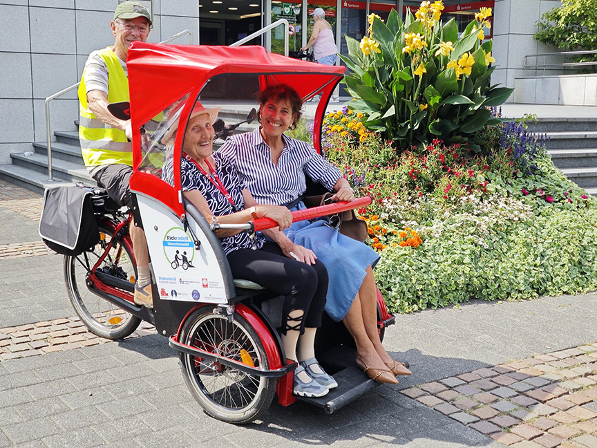 Gemeinsam mit Waltraud Kessler (90), Bewohnerin des Paulus-Stifts der Caritas, unternahm Sabine Anemüller, die Bürgermeisterin, jetzt die Premierenfahrt durch die Fußgängerzone Viersen. Sie  genoss die Fahrt zu zweit. und wird zitiert: „Ich freue mich, dass ältere und bewegungseingeschränkte Menschen nun mit der Rikscha auch in die Fußgängerzone gelangen können und wünsche mir, dass dies bald dauerhaft möglich sein wird.“